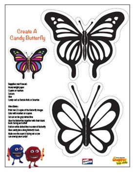 Also, don't forget to print out our April activities for kids to do at home! This month features a coloring sheet that teaches the three life stages of a butterfly and another butterfly snack using a piece of candy.