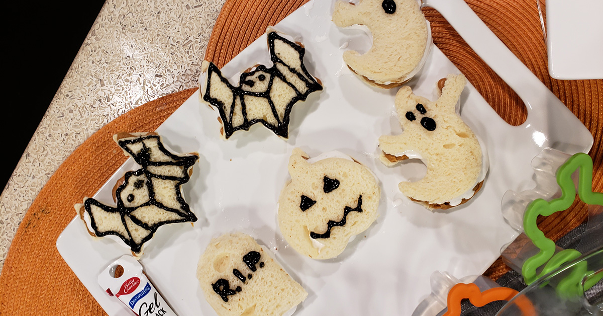 - Use Halloween-themed cookie cutters to cut shapes in bread.